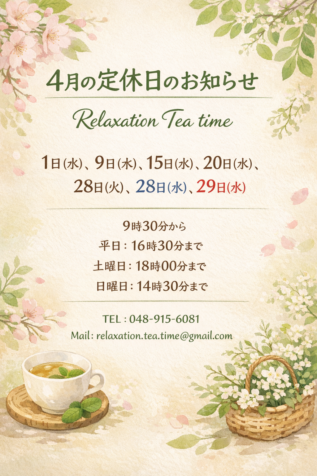 2026年4月の定休日のお知らせになります。